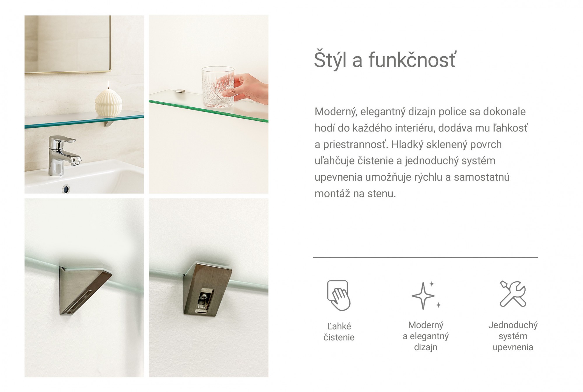- Materiál: Tvrdené sklo float zaručuje vysokú pevnosť a stabilitu police pri každodennom používaní.